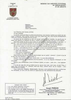 Imprimé électoral du candidat PSC Michel Pierson, membre de la liste Intérêts Communaux (tendance PSC) d'Ottignies-Louvain-la-Neuve, réalisé à l'occasion des élections communales du 10 octobre 1976.