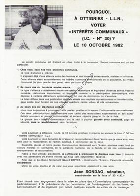 Imprimé électoral du sénateur PSC Jean Sondag, membre de la liste Intérêts Communaux (tendance PSC) d'Ottignies-Louvain-la-Neuve, réalisé à l'occasion des élections communales du 10 octobre 1982.