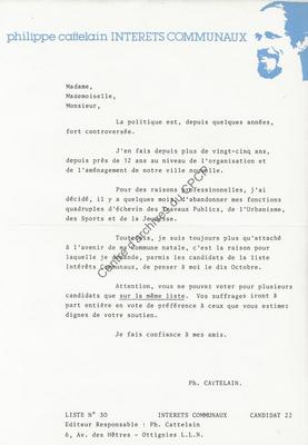 Imprimé électoral de Philippe Catellain, candidat de la liste Intérêts Communaux (tendance PSC) d'Ottignies-Louvain-la-Neuve, réalisé à l'occasion des élections communales du 10 octobre 1982.
