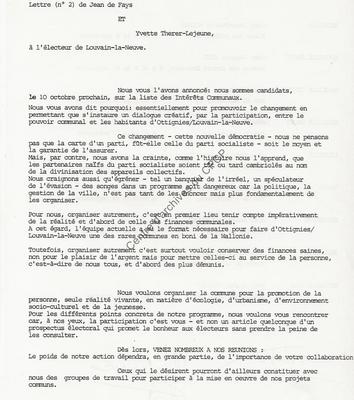 Imprimé électoral de Jean de Fays et Yvette Therer-Lejeune, candidats de la liste Intérêts Communaux (tendance PSC) d'Ottignies-Louvain-la-Neuve, réalisé à l'occasion des élections communales du 10 octobre 1982.