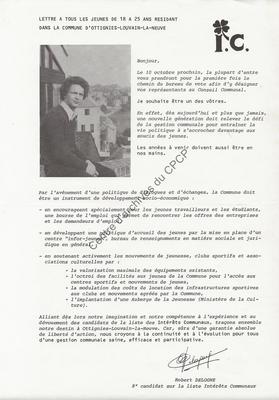 Imprimé électoral de Robert Delogne, candidat de la liste Intérêts Communaux (tendance PSC) d'Ottignies-Louvain-la-Neuve, réalisé à l'occasion des élections communales du 10 octobre 1982.