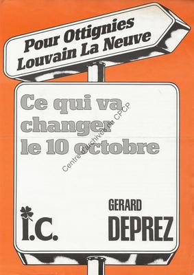 Imprimé électoral du président du PSC Gérard Deprez, candidat de la liste Intérêts Communaux (tendance PSC) d'Ottignies-Louvain-la-Neuve, réalisé à l'occasion des élections communales du 10 octobre 1982.
