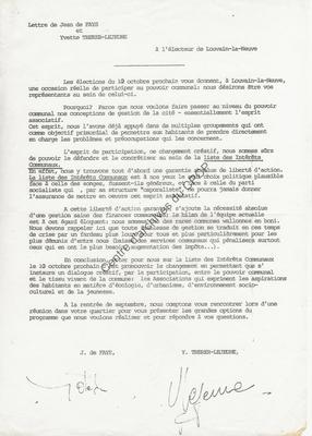Imprimé électoral de Jean de Fays et Yvette Therer-Lejeune, candidats de la liste Intérêts Communaux (tendance PSC) d'Ottignies-Louvain-la-Neuve, réalisé à l'occasion des élections communales du 10 octobre 1982.