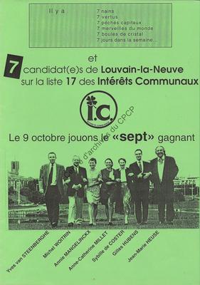 Imprimé électoral de candidats de la liste Intérêts Communaux (tendance PSC) d'Ottignies-Louvain-la-Neuve réalisé à l'occasion des élections communales et provinciales du 9 octobre 1994.