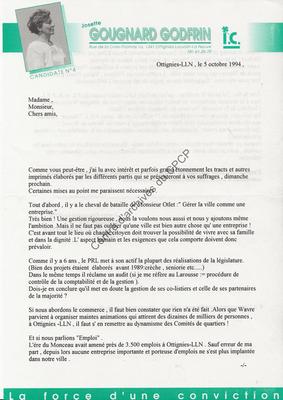 Imprimé électoral de Josette Gougnard-Godfrin, candidate de la liste Intérêts Communaux (tendance PSC) d'Ottignies-Louvain-la-Neuve, réalisé à l'occasion des élections communales et provinciales du 9 octobre 1994.