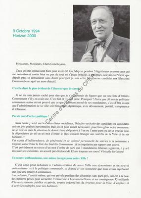 Imprimé électoral du bourgmestre PSC Yves du Monceau de Bergendal, candidat de la liste Intérêts Communaux (tendance PSC) d'Ottignies-Louvain-la-Neuve, réalisé à l'occasion des élections communales et provinciales du 9 octobre 1994.