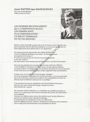Imprimé électoral de Annie Wattiez, candidate de la liste Intérêts Communaux (tendance PSC) d'Ottignies-Louvain-la-Neuve, réalisé à l'occasion des élections communales et provinciales du 9 octobre 1994.