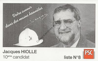 Imprimé électoral de Jacques Hiolle, candidat PSC à la ville de Saint-Ghislain, réalisé à l'occasion des élections communales et provinciales du 9 octobre 1994.