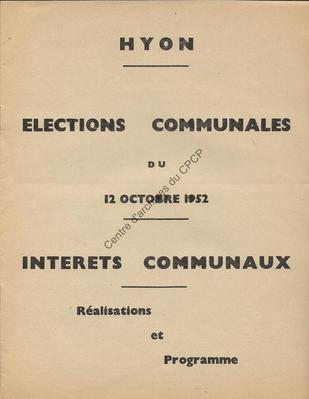 Imprimé électoral de la liste Intérêts Communaux (tendance PSC) de la commune de Hyon réalisé à l'occasion des élections communales du 12 octobre 1952.