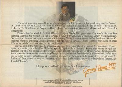 Imprimé électoral du président du PSC Gérard Deprez réalisé à l'occasion des élections européennes du 18 juin 1989.