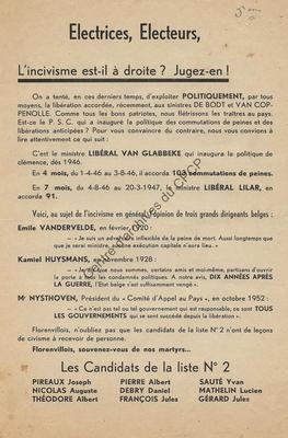 Imprimé électoral de la liste PSC de la commune de Florenville réalisé à l'occasion des élections communales du 12 octobre 1952.
