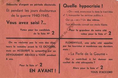 Imprimé électoral de la liste PSC de la commune de Florenville réalisé à l'occasion des élections communales du 12 octobre 1952.
