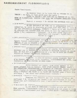 Imprimé électoral de la liste Rassemblement Florenvillois (tendance PSC) de la commune de Florenville réalisé à l'occasion des élections communales du 11 octobre 1970.