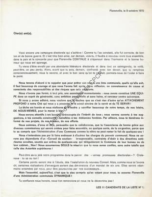 Imprimé électoral de la liste Rassemblement Florenvillois (tendance PSC) de la commune de Florenville réalisé à l'occasion des élections communales du 11 octobre 1970.