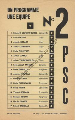 Imprimé électoral de la liste PSC de la commune de Sombreffe réalisé à l'occasion des élections communales du 10 octobre 1976.