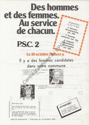 Imprimé électoral des Femmes PSC en faveur des candidates PSC de la commune de la Sombreffe réalisé à l'occasion des élections communales du 10 octobre 1976.