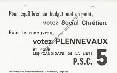 Imprimé électoral du candidat PSC de la commune de Sombreffe E. Plennevaux réalisé à l'occasion des élections communales du 10 octobre 1982.