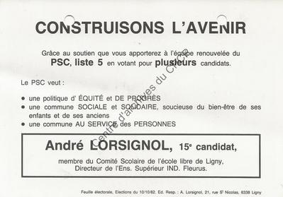 Imprimé électoral du candidat PSC de la commune de Sombreffe André Lorsignol réalisé à l'occasion des élections communales du 10 octobre 1982.