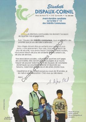 Imprimé électoral de la candidate PSC de la commune de Sombreffe Elisabeth Dispaux-Cornil réalisé à l'occasion des élections communales et provinciales du 9 octobre 1994.