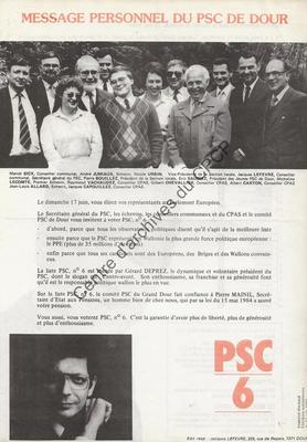 Imprimé électoral du PSC de Dour réalisé dans le cadre des élections européennes du 17 juin 1984.