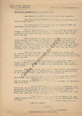 Imprimé électoral de la liste PSC de la commune de Jemappes réalisé à l'occasion des élections communales du 12 octobre 1952.
