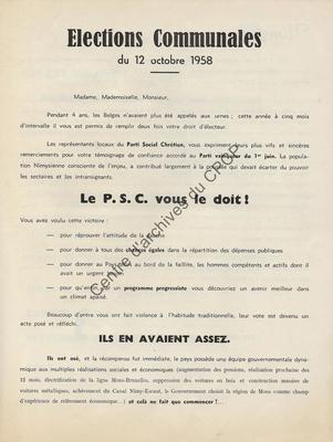 Imprimé électoral de la liste PSC de la commune de Nimy réalisé à l'occasion des élections communales du 12 octobre 1958.