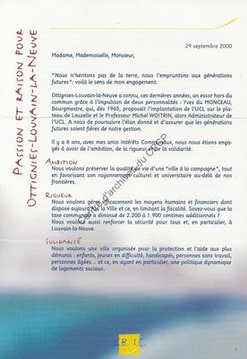 Imprimé électoral du candidat social chrétien Cédric du Monceau, membre de la liste « LB-IC » à Ottignies-Louvain-la-Neuve, réalisé à l'occasion des élections communales et provinciales du 8 octobre 2000.