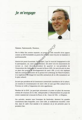 Imprimé électoral du candidat social chrétien Bernard Mangelinck, membre de la liste « PSC plus » à Ottignies-Louvain-la-Neuve, réalisé à l'occasion des élections communales et provinciales du 8 octobre 2000.
