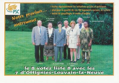Imprimé électoral de candidats sociaux-chrétiens membres de la liste « PSC plus » à Ottignies-Louvain-la-Neuve réalisé à l'occasion des élections communales et provinciales du 8 octobre 2000.