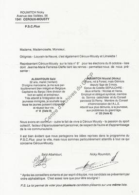 Imprimé électoral de candidats de la liste « PSC plus » à Ottignies-Louvain-la-Neuve réalisé à l'occasion des élections communales et provinciales du 8 octobre 2000.