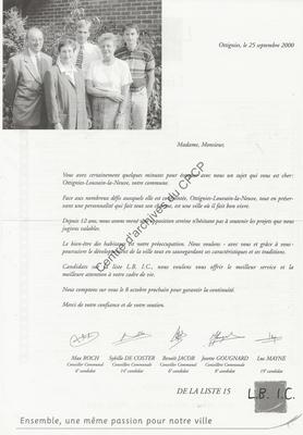 Imprimé électoral des candidats sociaux-chrétiens membres de la liste « LB-IC » à Ottignies-Louvain-la-Neuve réalisé à l'occasion des élections communales et provinciales du 8 octobre 2000.
