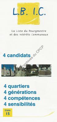 Imprimé électoral de candidats de la liste « LB-IC » à Ottignies-Louvain-la-Neuve réalisé à l'occasion des élections communales et provinciales du 8 octobre 2000.