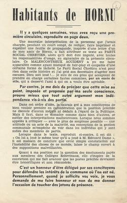 Imprimé électoral de la liste « Union Communale » (tendance PSC) de la commune de Hornu réalisé à l'occasion des élections communales du 12 octobre 1952.