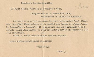 Imprimé électoral de la liste « Union Communale » (tendance PSC) de la commune de Hornu réalisé à l'occasion des élections communales du 12 octobre 1952.