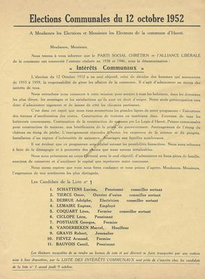 Imprimé électoral de la liste « Intérêts Communaux » (liste rassemblant le PSC et les libéraux) de la commune d'Havré réalisé à l'occasion des élections communales du 12 octobre 1952.