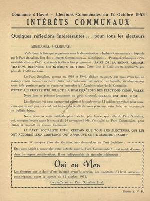 Imprimé électoral de la liste « Intérêts Communaux » (liste rassemblant le PSC et les libéraux) de la commune d'Havré réalisé à l'occasion des élections communales du 12 octobre 1952.