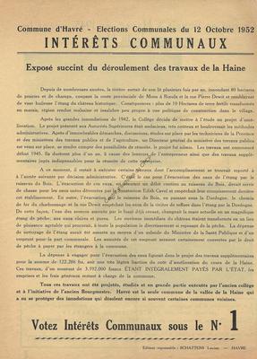 Imprimé électoral de la liste « Intérêts Communaux » (liste rassemblant le PSC et les libéraux) de la commune d'Havré réalisé à l'occasion des élections communales du 12 octobre 1952.