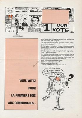 Imprimé électoral des Jeunes PSC à destination des primo-votants réalisé à l'occasion des élections communales du 10 octobre 1982.