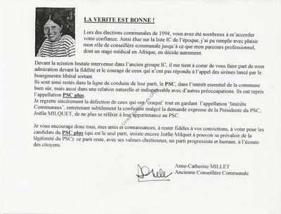 Imprimé électoral de soutien de l'ancienne conseillère communale Anne-Catherine Millet à la liste « PSC plus » (Ottignies-Louvain-la-Neuve) réalisé à l'occasion des élections communales et provinciales du 8 octobre 2000.