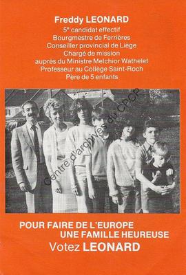 Imprimé électoral du conseiller provincial PSC Freddy Leonard réalisé dans le cadre des élections européennes du 17 juin 1984.