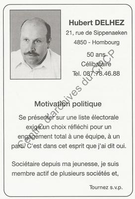 Imprimé électoral du candidat du Nouveau PSC de Plombières Hubert Delhez réalisé à l'occasion des élections communales et provinciales du 8 octobre 2000.
