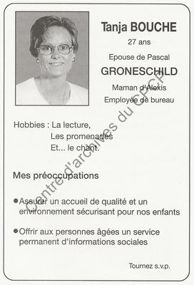 Imprimé électoral de la candidate du Nouveau PSC de Plombières Tanja Bouche réalisé à l'occasion des élections communales et provinciales du 8 octobre 2000.