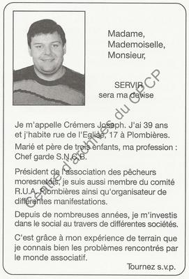 Imprimé électoral du candidat du Nouveau PSC de Plombières Joseph Crémers réalisé à l'occasion des élections communales et provinciales du 8 octobre 2000.