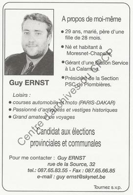 Imprimé électoral du candidat du Nouveau PSC de Plombières Guy Ernst réalisé à l'occasion des élections communales et provinciales du 8 octobre 2000.