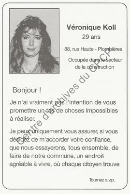 Imprimé électoral de la candidate du Nouveau PSC de Plombières Véronique Koll réalisé à l'occasion des élections communales et provinciales du 8 octobre 2000.