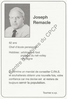 Imprimé électoral du candidat du Nouveau PSC de Plombières Joseph Remacle réalisé à l'occasion des élections communales et provinciales du 8 octobre 2000.