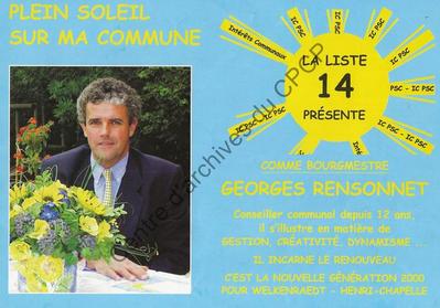 Imprimé électoral du candidat du Nouveau PSC de Welkenraedt Georges Rensonnet réalisé à l'occasion des élections communales et provinciales du 8 octobre 2000.