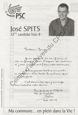 Imprimé électoral du candidat du Nouveau PSC de Herve José Spits réalisé à l'occasion des élections communales et provinciales du 8 octobre 2000.
