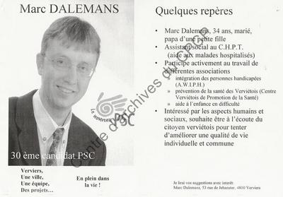 Imprimé électoral du candidat du Nouveau PSC de Verviers Marc Dalemans réalisé à l'occasion des élections communales et provinciales du 8 octobre 2000.