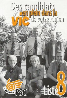 Imprimé électoral de candidats du Nouveau PSC à la province de Liège réalisé à l'occasion des élections communales et provinciales du 8 octobre 2000.